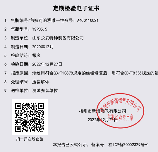 报废原因:螺纹用符合GB/T10878规定的丝锥修复后,用符合GB/T8336规定的量规检查,结果仍不符合GB8335的要求 处理结果:压扁解体 点击查看附表1(合格气瓶一览表) 点击查看附表2(报废气瓶一览表) | ||